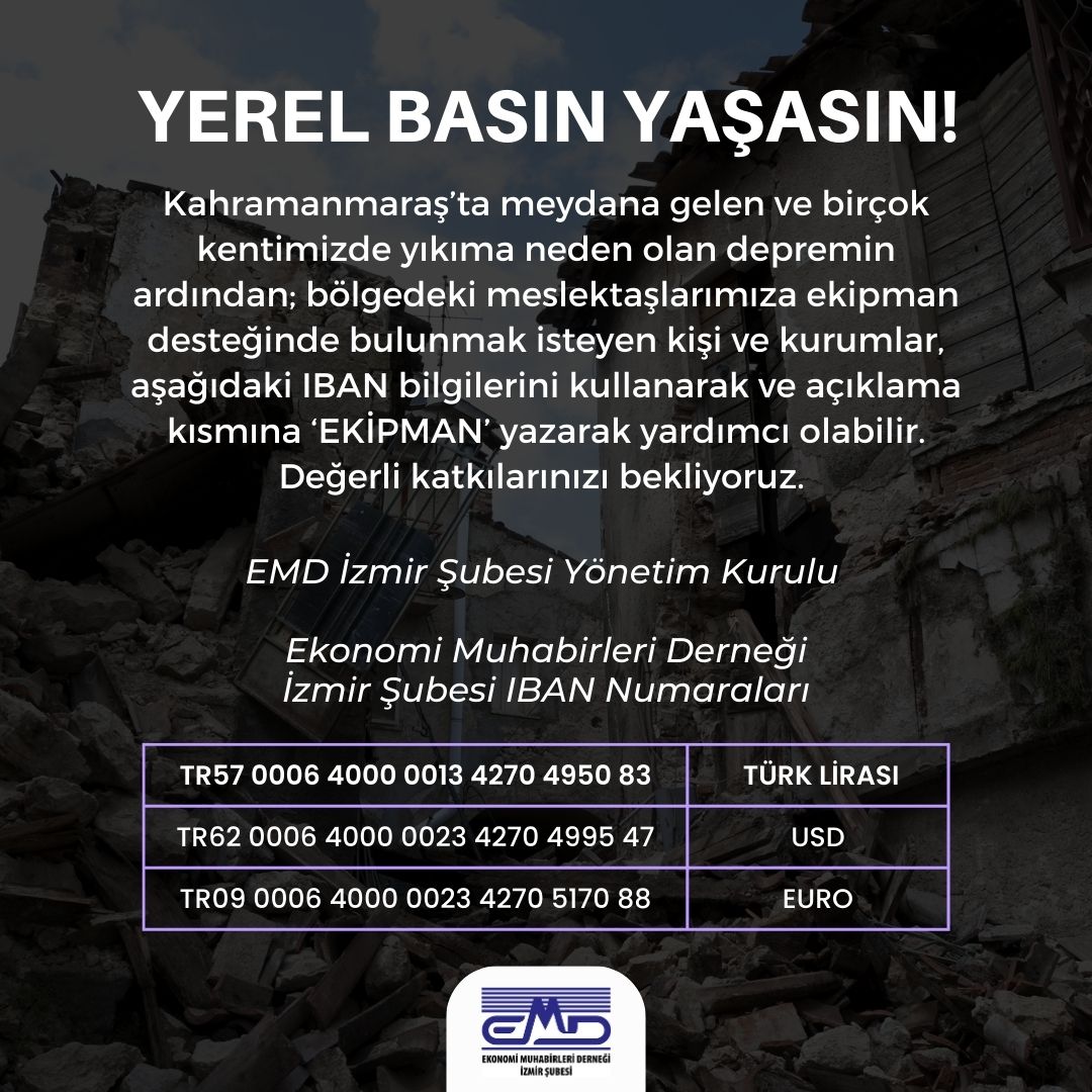YEREL BASIN YAŞASIN! diyorsanız yine EKONOMİ MUHABİRLERİ DERNEĞİ İZMİR ŞUBESİ hesabına açıklama bölümüne EKİPMAN yazarak EFTnizi yapabilirsiniz.