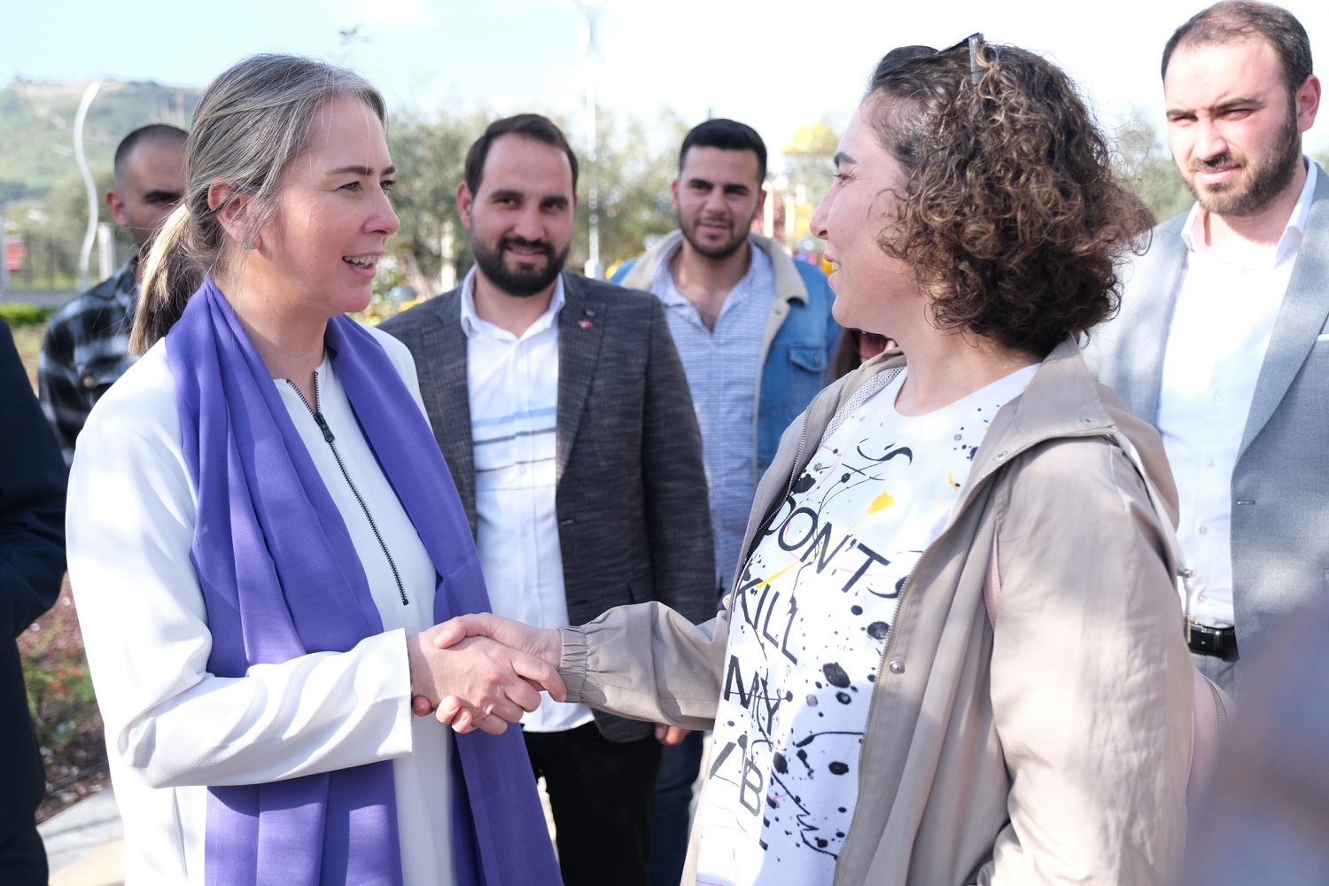 Programına Bergama Kapalı Pazaryerinde devam eden Çankırı esnafın öneri ve taleplerini dinledi. Çankırıya AK Parti Bergama İlçe Başkanı Sebahattin Güzel ile çok sayıda partili eşlik etti. Seçim listelerinde AK Partinin kadın aday sayısına ağırlık vermesini takdirle karşıladıklarını belirten Beytullah Ata isimli pazar esnafı; Dünya yangın yerine döndü. Ülkemizin etrafı ateş çemberiyle sarılı. Hükümet elinden geleni yapıyor. Ama biz galiba toplum olarak şükretmeyi unuttuk dedi. Bergama Arastasında listelerde AK Partinin kadın adaylara ağırlık vermesinden dolayı duydukları mutluluğu dile getiren vatandaşlar Çankırıya İzmirin ablası oldunuz sözleriyle övgü yağdırdı. Bergama Kapalı Çarşı ziyaretinde Çankırıyı Cumhurbaşkanı Erdoğanın bayrağıyla karşılayan Kamil Çetil isimli esnaf, Bu toplum vatanını da bayrağını da yerde bulmadı. Bu yüzden yine biz kazanacağız dedi.