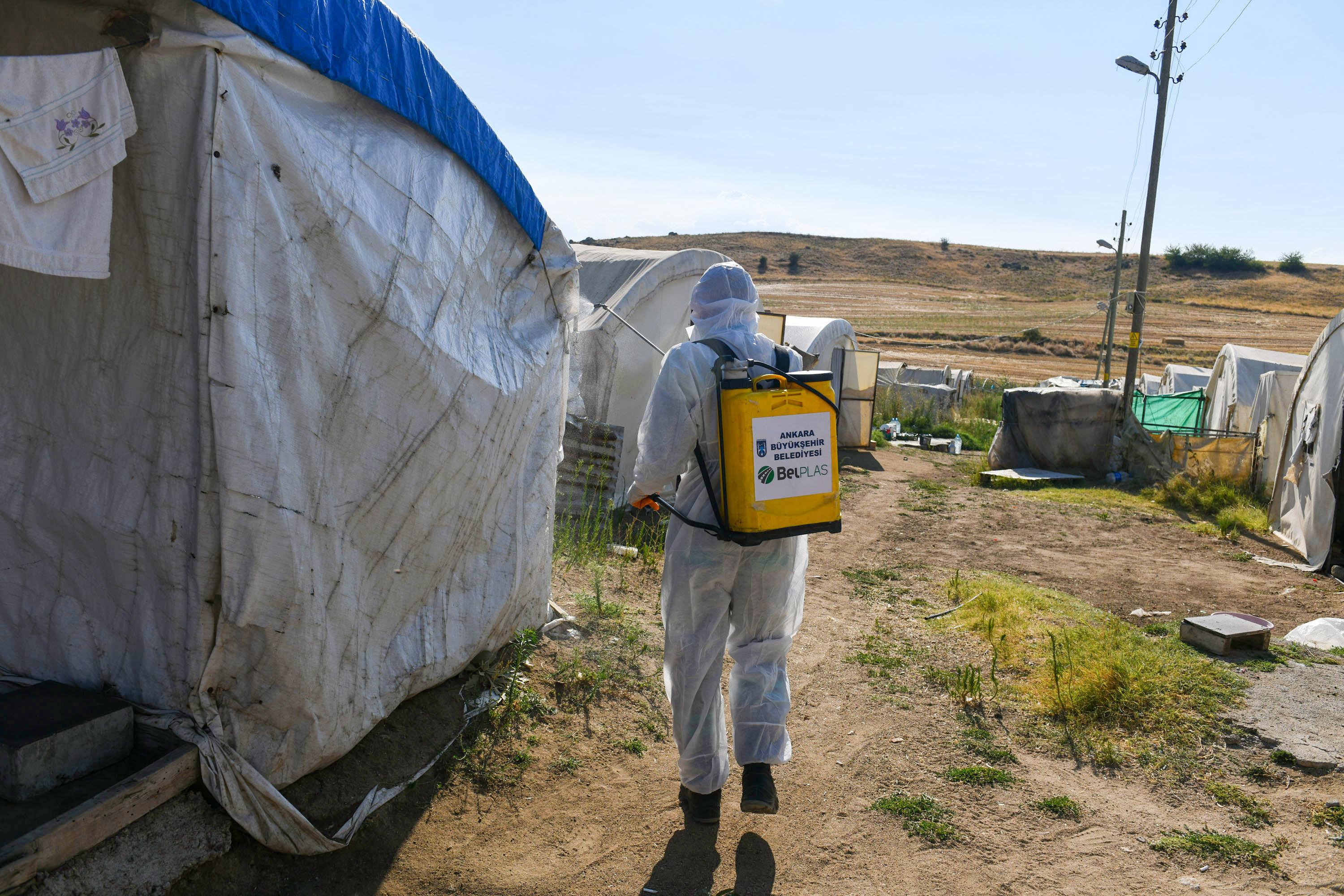 Türkiyenin çeşitli bölgelerinden Ankaraya gelerek kurdukları çadırlarda kalabalık aileler olarak yaşayan tarım işçilerine sağlanan yardımları sürekli hale getireceklerini vurgulayan Sağlık İşleri Daire Başkanlığı İş Sağlığı ve Güvenliği Şube Müdürü Mustafa Can, Ankara'da bulunan tarım işçilerimize yönelik hijyen kiti dağıtımı, mobil duş hizmeti ve ilaçlama hizmetiyle ilgili başlattığımız projeler kapsamında Ankara'nın farklı lokasyonlarında bulunan mevsimlik tarım işçilerine ziyaretlerde bulunuyoruz. Mevsimlik tarım işçilerimizi daha iyi şartlarda misafir edebilmek için onların barınma merkezlerini daha iyi hale getirmek için projelerimizi sürdüreceğiz diye konuştu.