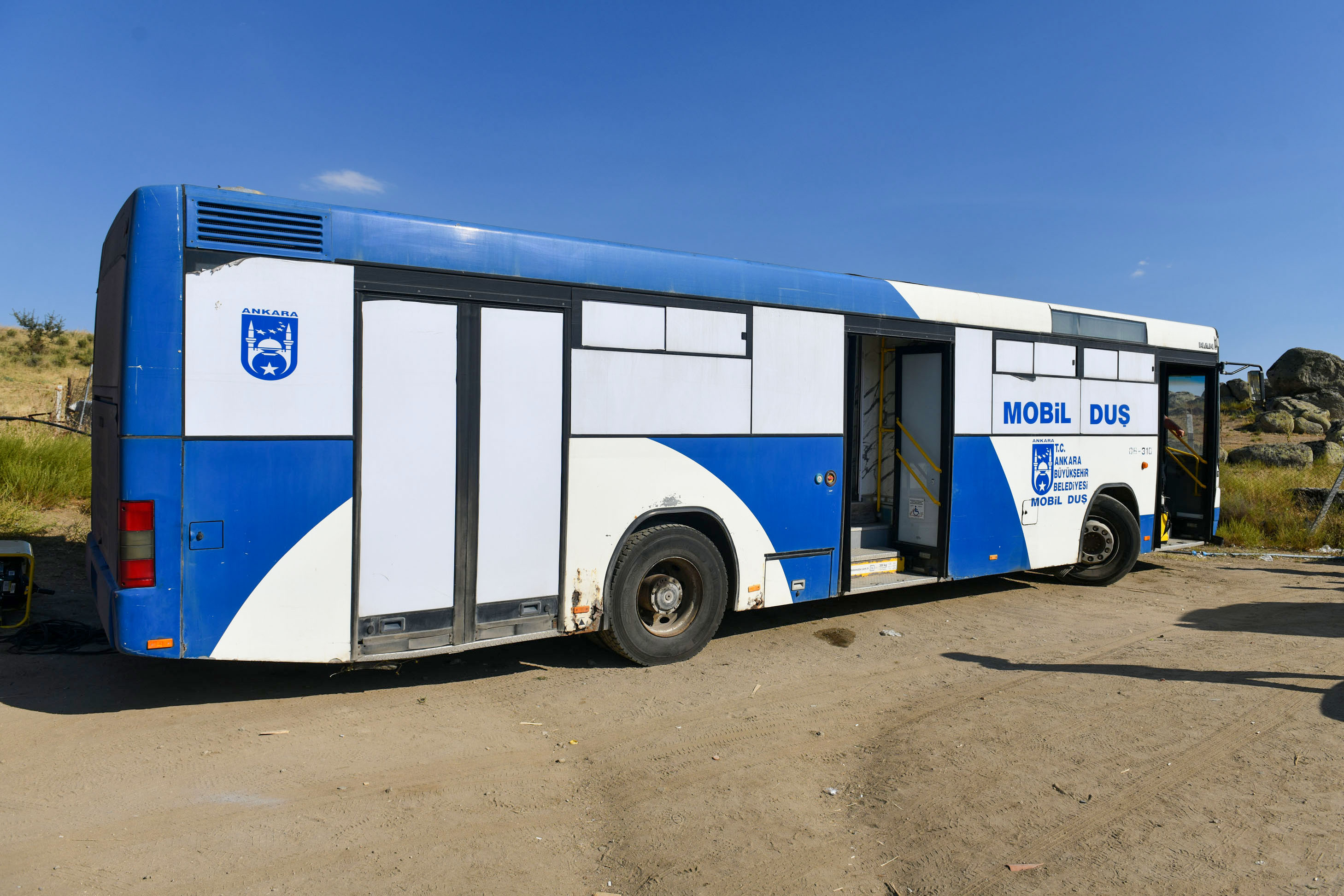 Kullanım ömrünün dolması nedeniyle atıl duruma düşen otobüslerden dönüştürülen mobil duş araçlarının içinde duş kabinleri, lavabo, şampuan ve sabun bulunuyor.