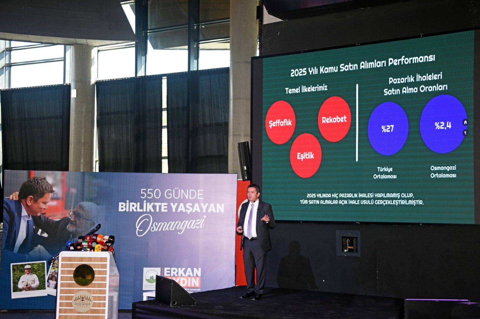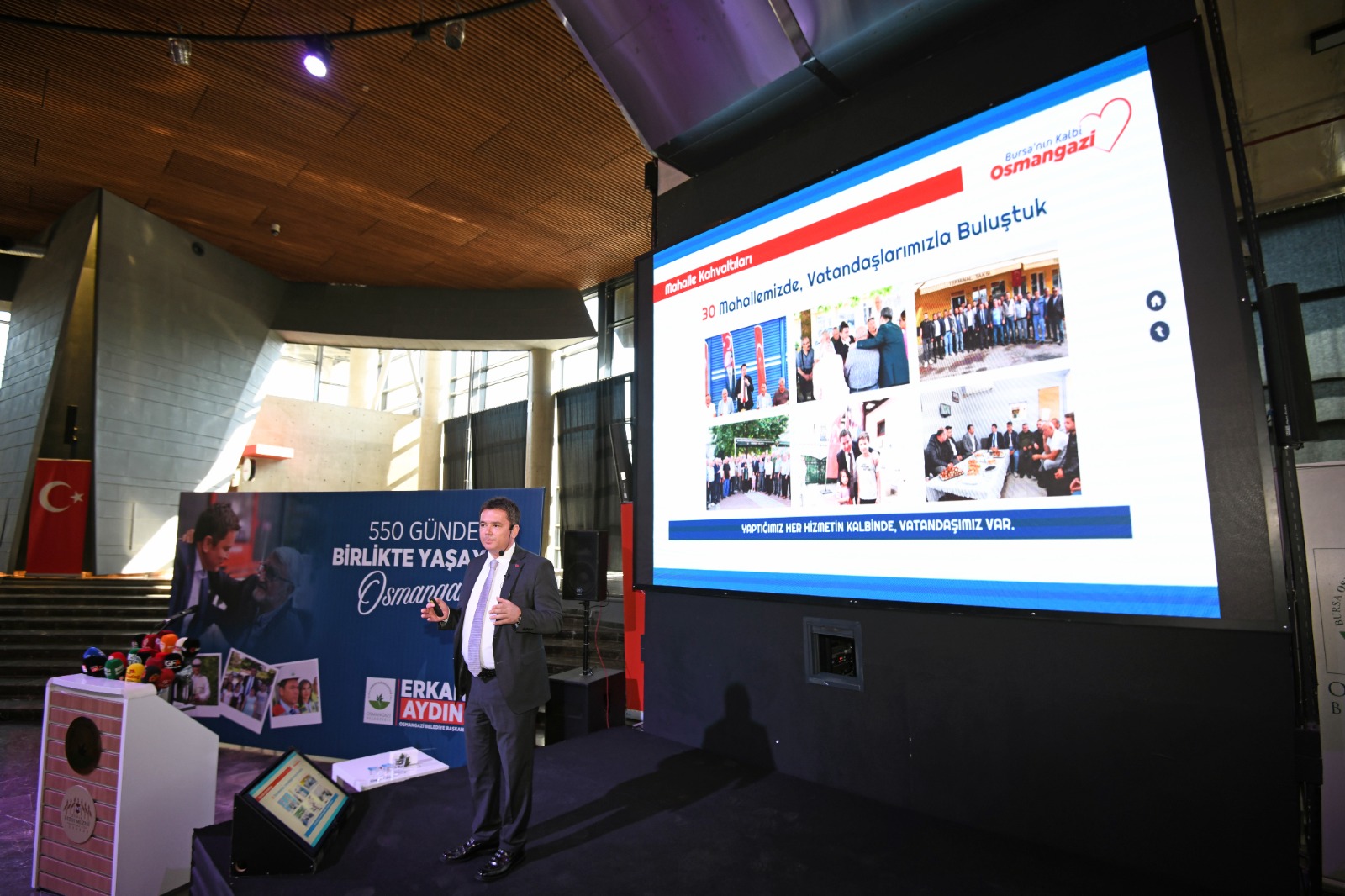 Panorama 1326 Bursa Fetih Müzesi’nde düzenlenen toplantıda 550 günün özetini paylaşan Başkan Aydın, “Bu sürede 35 temel atma ve açılış gerçekleştirdik. Henüz açılışını yapmadığımız 3 kreş, 1 sağlık ocağı ve temeli atılacak 4 yapımız daha var” dedi.