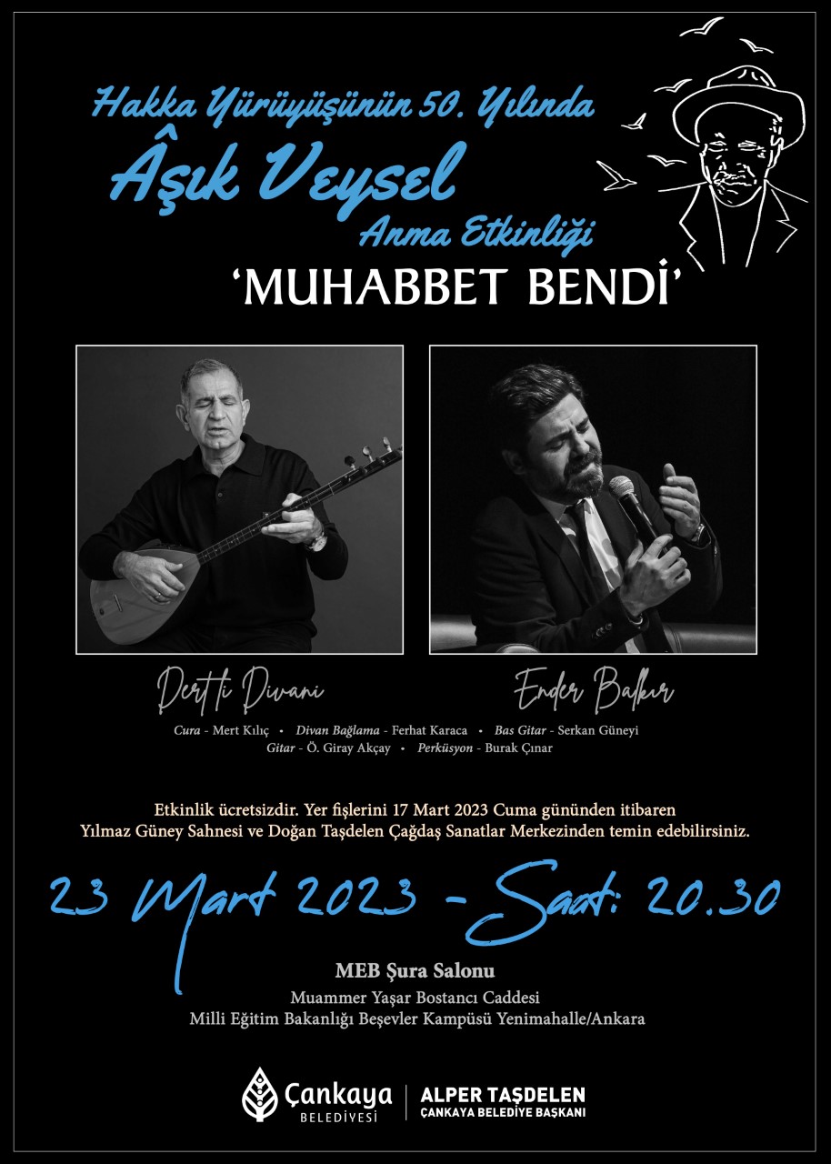 Çankaya Belediyesi ölümünün 50'nci yıldönümünde büyük ozan Aşık Veysel'i Halk Müziği sanatçıları Dertli Divani ve Ender Balkır'ın sahne alacağı "Muhabbet Bendi" konseriyle anıyor.