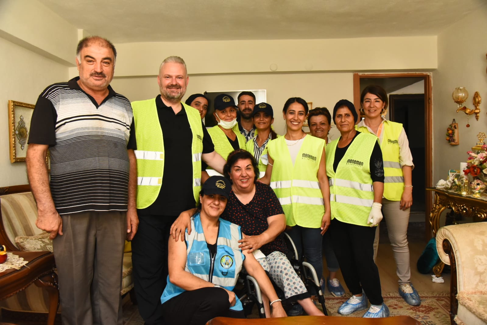 Çocuk Felci nedeniyle henüz 8 yaşındayken geçirdiği Çocuk Felci nedeniyle 2 ayağını birden kullanamayan Figen Soyaslan, bir süre önce Menemene taşındı. Tekerlekli sandalye ile hayatını sürdüren 68 yaşındaki Soyaslan, Menemen Belediyesini arayarak Evde Bakım Hizmetleri ekibinden yardım istedi. Çocuğu olmayan Soyaslana Sosyal İşler Müdürlüğüne bağlı ekipler tarafından evde bakım, temizlik, kişisel bakım ve fizyoterapist hizmeti verilmeye başlandı. Belediye hizmetlerinden memnuniyetini dile getirmek ve teşekkür etmek için Menemen Belediye Başkanı Aydın Pehlivanı ziyaret etmek isteyen Soyaslana talebinin