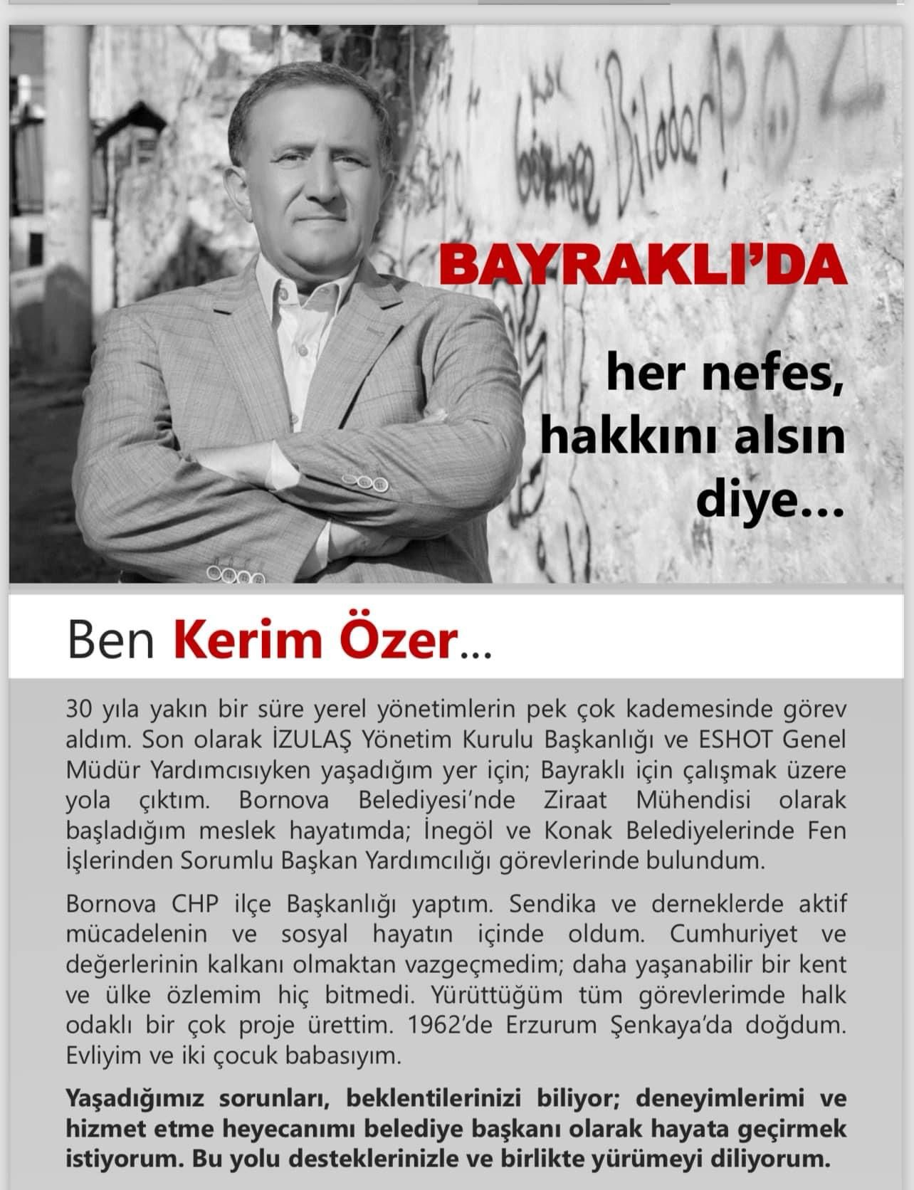 Geçtiğimiz dönem de Bayraklı Belediye Başkanlığı için başvuru yapan deneyimli siyasetçi Özer; istifasının ardından bir açıklama yaptı. Kerim Özer; Değişim ve Deneyim mottosuyla yola çıktıklarını; tüm bilgi ve birikimi ile Bayraklıya hizmet etmek istediğini söyledi. Özer; şunları kaydetti; Cumhuriyet Halk Partisi çatısı altında her yola her dönemece tanıklık ettim, emek verdim. Şimdi partimin adayı olarak yaşadığım ilçeye, Bayraklıya hizmet etmek istiyorum. Etle tırnak gibi olduğum Bayraklı için çalışmak istiyorum. Büyükşehir Belediyesi bünyesinde; bürokrat olarak ve ulaşım gibi bir alanda çok değerli bir süreç yaşadım. Büyük bir fırsat, emek ve üretim süreciydi. Tüm ekip arkadaşlarıma sonsuz teşekkür ediyorum. Belediyecilikte ve siyasette biriktirdiklerimi ilçem için hayata geçirme heyecanını yaşıyorum. Bu heyecan ne diner ne de biter. Ne yapılması gerektiğini biliyoruz ve bunları Bayraklıya sunmak için sabırsızlanıyoruz.