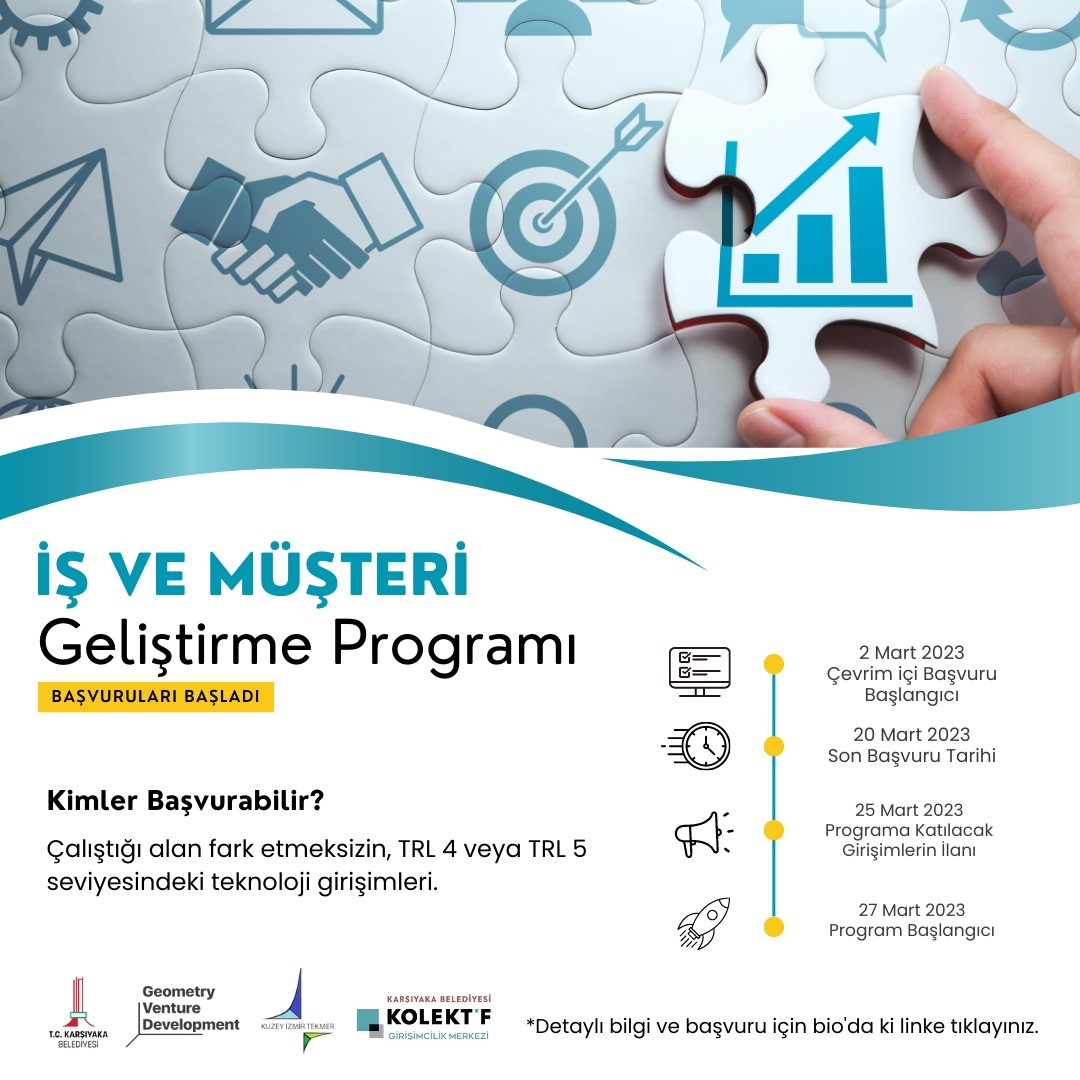 Çalıştığı alan fark etmeksizin TRL 4 veya TRL 5 seviyesindeki teknoloji girişimlerinin başvuru yapabileceği program için son başvuru tarihi 20 Mart 2023. Programa katılmak isteyen girişimcilerin başvuru formunu doldurmaları yeterli olacak. 25 Mart 2023 tarihinde programa katılmaya hak kazanan girişimler Karşıyaka Belediyesi Kolektif Girişimcilik Merkezi web sitesinden duyurulacak.