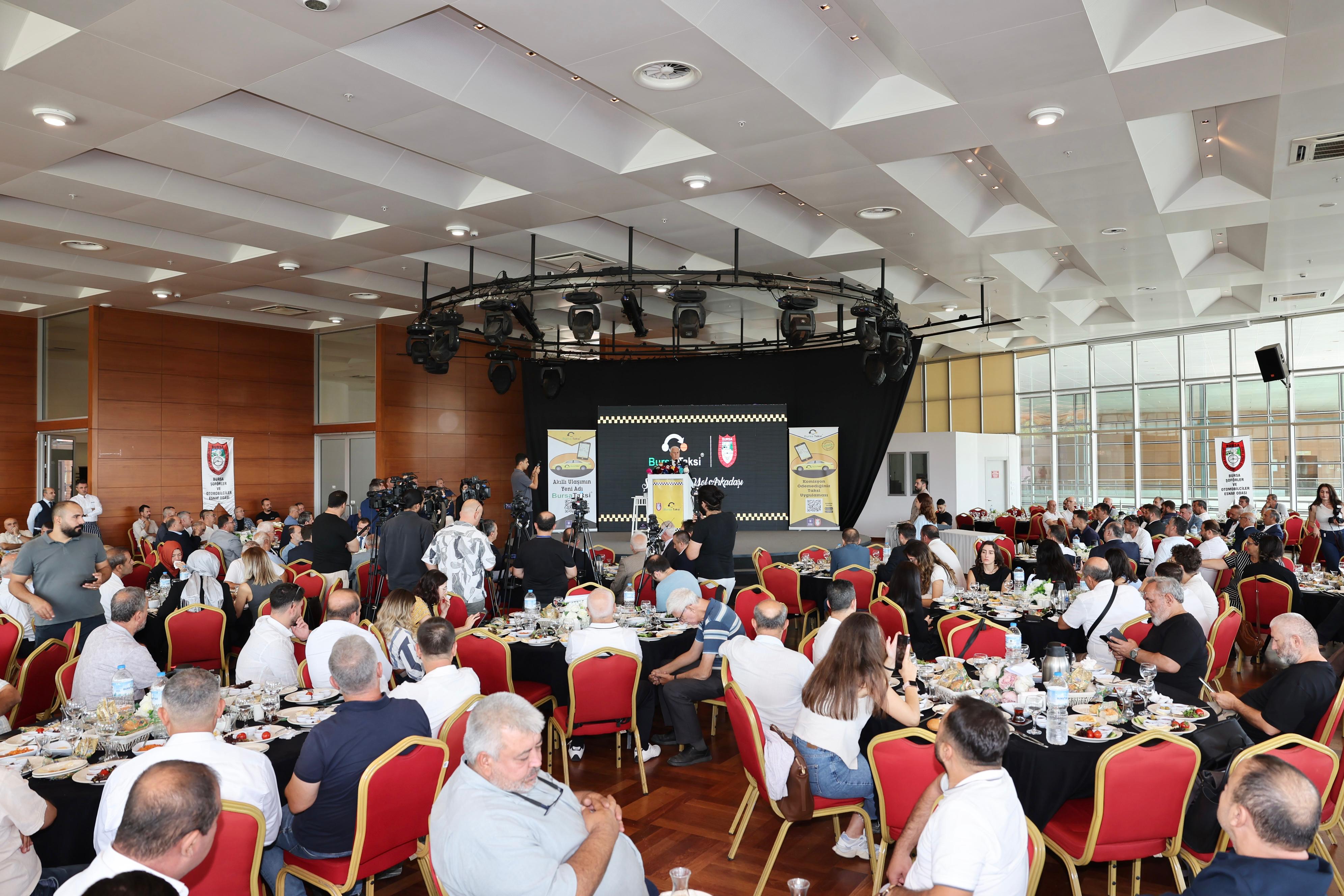 Atatürk Kültür Merkezi Merinos Yerleşkesi’nde düzenlenen ‘Bursa Taksi’ projesi tanıtım toplantısına, Büyükşehir Belediye Başkanı Mustafa Bozbey’in yanı sıra Bursa Esnaf ve Sanatkarlar Odası (BESOB) Başkanı Fahrettin Bilgit, Bursa Şoförler ve Otomobilciler Esnaf Odası Başkanı Ahmet Çakır, Büyükşehir Belediyesi yöneticileri, oda başkanları ve taksici esnafı katıldı.