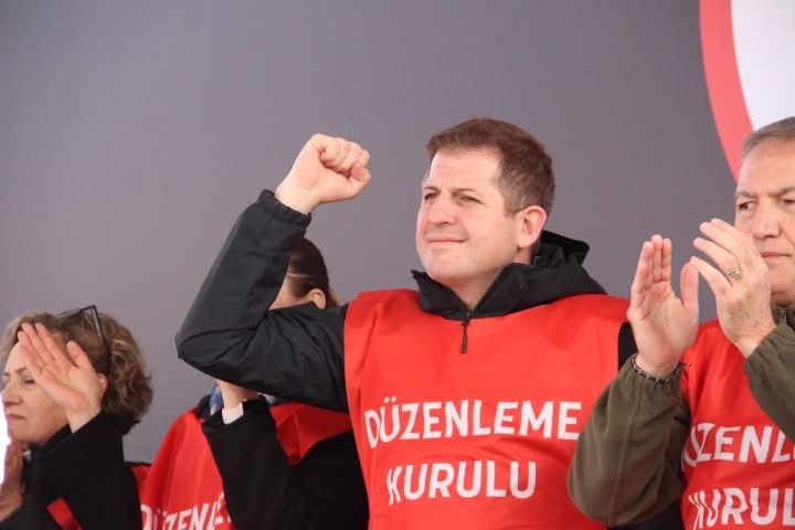 Kalabalığın içinde bir yumruk havaya kalkmış, yüzlerde kararlılık, gözlerde inanç var.
